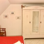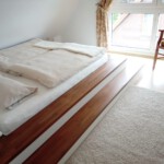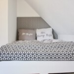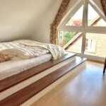 Das helle Dachgeschosszimmer überrascht Sie mit einem eigens aus Vollholz maßgefertigtem luxuriösen Stufenbett, welches auf einer Liegefläche von 200 x 200 cm höchstmöglichen Komfort bietet. Hier können Sie sich wunderbar zurückziehen, um im gemütlichen Sessel zu lesen oder einen schönen Film zu genießen.