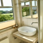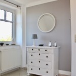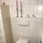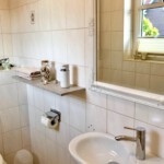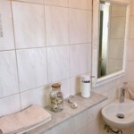 Unser geräumiges Tageslichtbad im ersten Obergeschoss ist umfangreich ausgestattet. Neben einer Dusche und einem WC besticht es durch seinen Waschtisch mit Mosaikfliesen. Für unsere kleine Gäste steht ein Hocker zur Verfügung. In unserem großen Schrank finden Sie neben einem Fön und Kosmetikspiegel noch ausreichend Platz für Ihre privaten Badutensilien.
